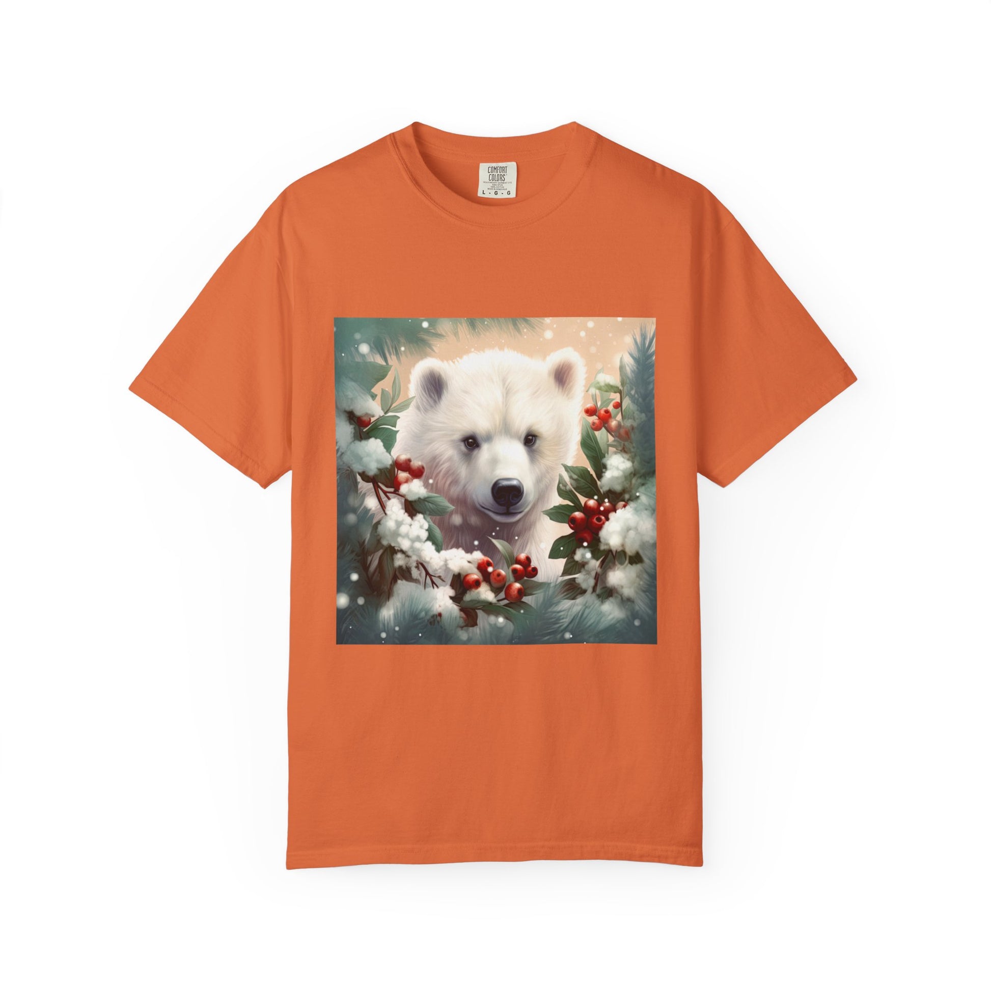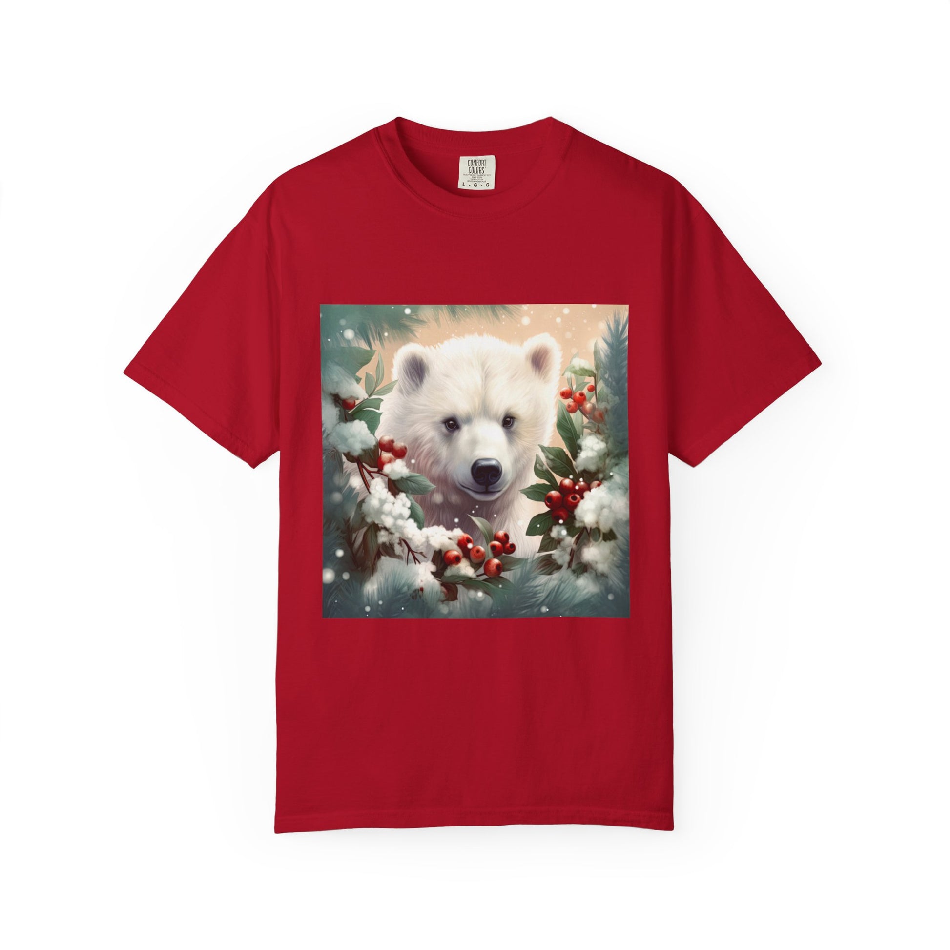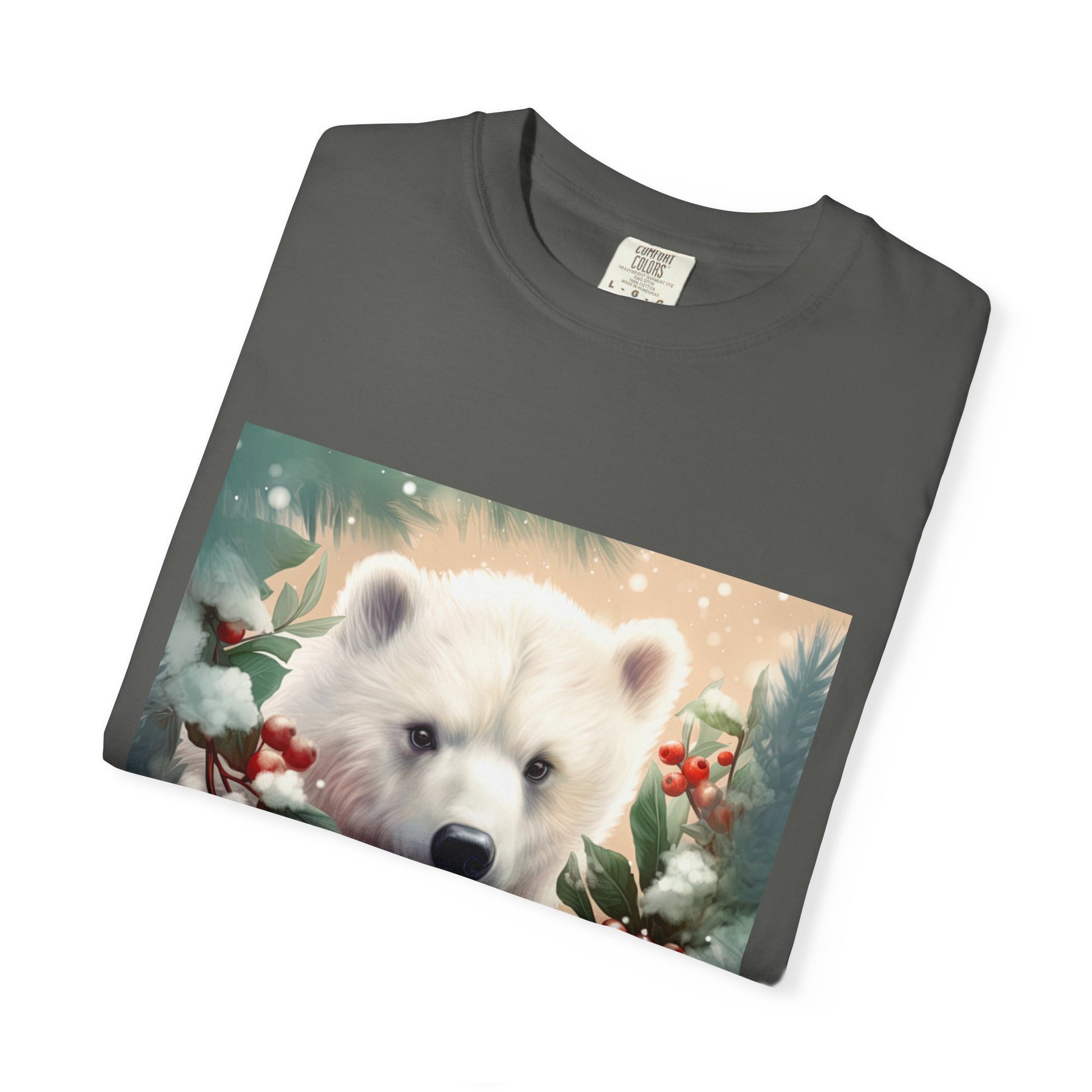 Soft, lived-in comfort meets quiet winter wonder. This garment-dyed tee carries a serene polar bear portrait framed by frosty evergreens and bright red berries — a calm, cozy image that sits gently on the chest. The midweight cotton drapes with a relaxed fit, the dyeing after construction gives the color a muted, vintage feel, and the tubular knit keeps the silhouette clean and simple. Wear it on slow mornings with a mug of something warm, layered beneath a flannel for night walks, or around the cabin when you want clothing that feels as familiar as a memory.